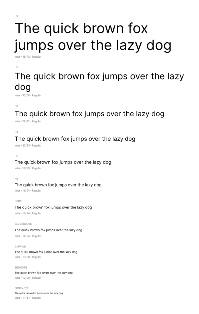 Due to time and resource constraints, the typographic system was built using Inter a highly legible and production-ready typeface.